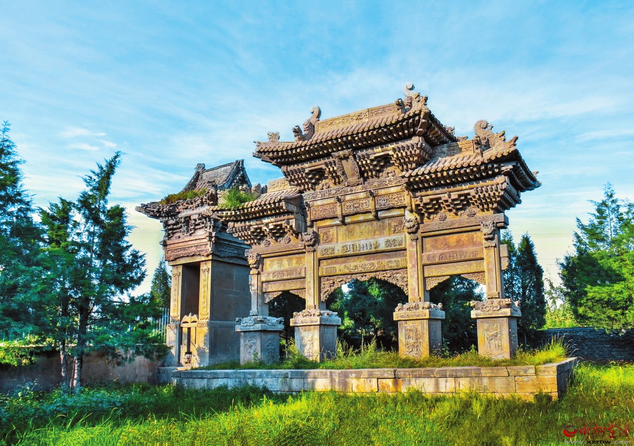 坐落于村中的朱氏牌樓是晚清中儀大夫、陜西延榆綏兵道加鹽運(yùn)使武訪疇為其母所修的節(jié)孝牌坊。它不僅見證了朱氏家族的輝煌歷史,也反映了當(dāng)時(shí)社會(huì)的文化風(fēng)貌,承載著豐富的歷史文化內(nèi)涵,為第八批全國重點(diǎn)文物保護(hù)單位。牌樓有主坊和配坊兩座,主坊矗立在村內(nèi)南街,面寬三間,四柱三樓,重檐歇山頂,高近11米、寬15米。欄板內(nèi)剔底雕刻成一幅幅人物故事圖案,霸王柱間鏤雕丹鳳朝陽。匾形走馬板上書“柏舟矢志”“竹柏流芳”各四字。牌坊下檐明間置匾一塊,書“圣旨”二字,兩次間匾書分別為“懿范”“徽音”。配坊在村南,高8米有余,四柱三門,單檐歇山頂,規(guī)模略小,造型風(fēng)格與主坊一樣,皆為石雕藝術(shù)精品。