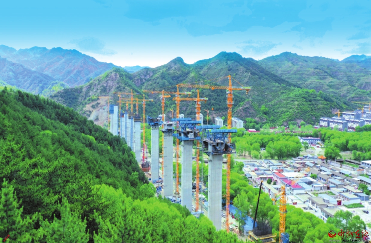 在雄忻高鐵五臺山段項目施工現(xiàn)場,青山環(huán)抱中,機(jī)械轟鳴,工程車輛穿梭。