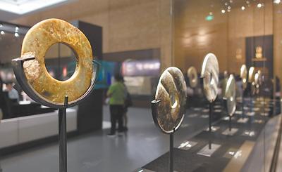 良渚博物院坐落在浙江杭州市余杭區(qū)美麗洲公園內,是全面展示良渚文化的考古遺址博物館。圖為良渚遺址出土的玉器。