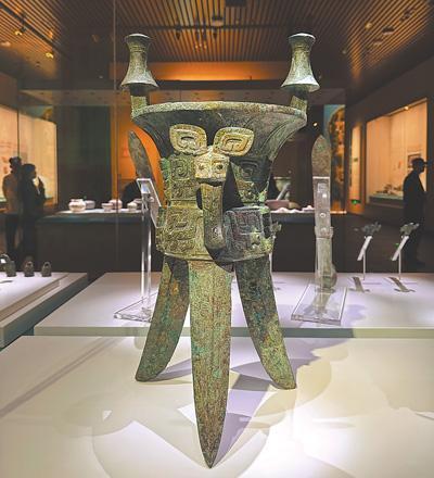 殷墟博物館與殷墟宗廟宮殿區(qū)隔河相望,是全景式展現商文明的國家重大考古專題博物館。圖為殷墟博物館里展出的殷墟婦好墓出土的銅斝。
