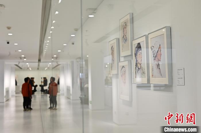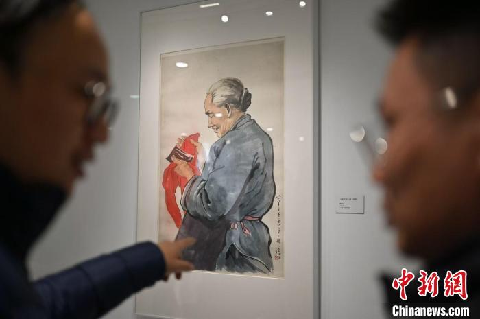 圖為展覽展出的《一輩子第一回》(草圖)吸引參觀者。 陳楚紅 攝