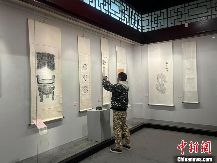 12月24日,湖北省級非遺項(xiàng)目“金石器物全形傳拓技藝”代表性傳承人張友海(右)帶領(lǐng)友人參觀武漢博物館“墨拓千秋——金石器物全形傳拓技藝保護(hù)成果展”。中新社記者 武一力 攝