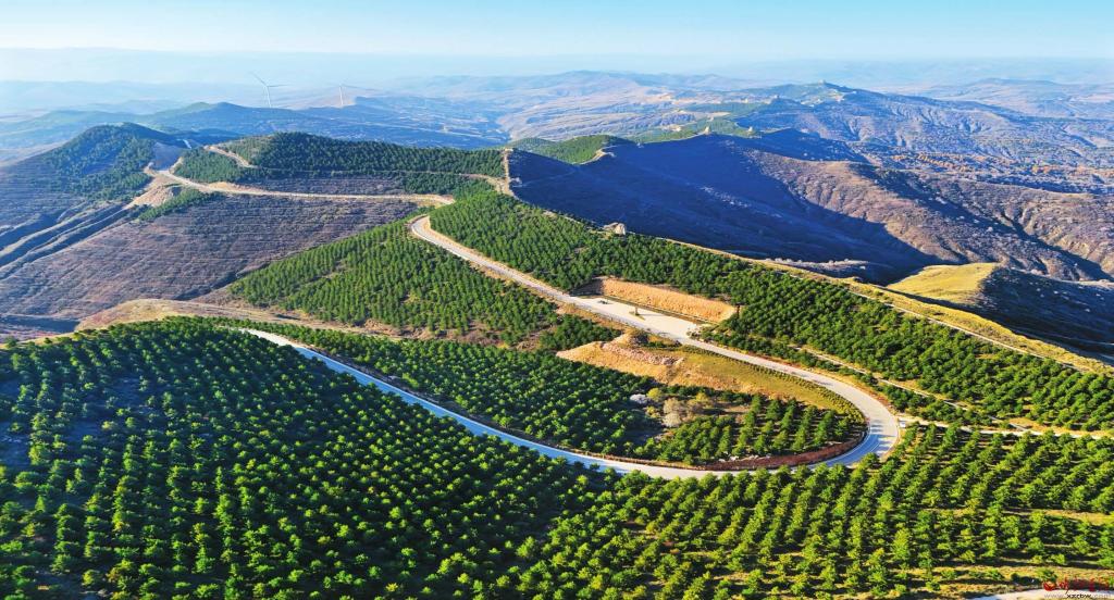邊塞重地,長年征戰(zhàn),風(fēng)沙肆虐,溝壑縱橫。特殊的地理位置和惡劣的氣候條件,導(dǎo)致偏關(guān)的原始植被幾近絕跡。偏關(guān)人一年中有半年在植樹造林,人工搬苗,人工運水,從山下到山上,再從山上到山下,來回往返,汗水淌過春夏秋冬,足跡踏遍山嶺圪梁。為減少水土流失,他們在山坡上挖交錯排列的魚鱗坑,以貯存“貴如油”的雨水,為油松提供有限的囊盡天地之饋贈的水肥。淺淺的土層,種不下高頭大樹,僅能讓幾十厘米的油松保持直立。偏關(guān)人誓將“荒山”變“綠山”,“換書記不換主意,換縣長不換主張”“一任接著一任干,一級干給一級看”……以堅韌之力重塑山河、治理生態(tài),以愚公之力見縫插綠、逢山播綠,以“饅頭加镢頭、燴菜加會戰(zhàn)”的不屈精神,年年歲歲,綠色接力,將偏關(guān)打造成全省生態(tài)建設(shè)紅旗縣,黃河流域生態(tài)文明建設(shè)先進縣,在不毛之地寫下綠色詩行,筑起綠色長城。