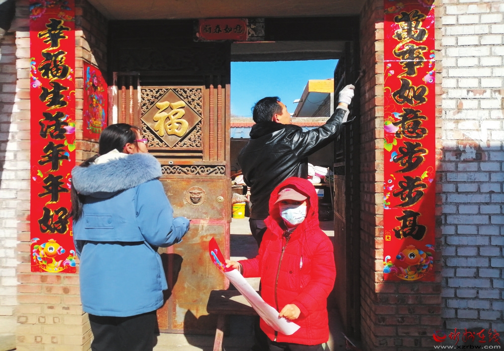 喜氣洋洋貼對聯(lián)。 宮清華攝 送福添彩共迎春 春聯(lián),俗稱“對子”,屬對聯(lián)的范疇。是過年時門面的裝點,是驅(qū)邪納福、增添節(jié)日喜慶的重要形式之一。 古時候人們?yōu)榱吮傩跋麨?,防止妖魔鬼怪進門,便在門的兩旁各掛一塊桃木板,稱之為“桃符”。到了五代十國時期,出了一位很有文才的國君叫孟昶,過年時他在桃符板上寫了“新年納余慶,佳節(jié)號長春”的獻歲詞句,這便是我國最早的春聯(lián),由此文人學士們也將好詩之風與春節(jié)的喜慶氣氛融合在一起,紛紛把題寫春聯(lián)視為一大雅事。至宋代由于造紙術的發(fā)明普及,對聯(lián)已廣為流行。到了明代,在朱元璋的倡導和推廣下,春聯(lián)大盛,貼春聯(lián)逐漸成為中國的一種過年習俗。無論有錢沒錢,還是識不識字,每逢過年,家家都會在自家門上張貼大紅色的春聯(lián)。 對聯(lián)一般要求上下聯(lián)字數(shù)相等,句式結(jié)構對稱,詞性相對,聯(lián)內(nèi)平仄交替,上下聯(lián)平仄對仗,在裁好的紅紙上用毛筆蘸墨書寫。但在民間,人們普遍注重對聯(lián)的內(nèi)容含義,似乎對平仄關系和對仗問題要求并不那么嚴格考究,有時會以幽默詼諧的詞句作為對聯(lián)用語。 20世紀,在春聯(lián)書寫的內(nèi)容上,有根據(jù)自身特點和意愿自編帶有個性色彩的,一度時期還有用偉人詩詞的,當然也不排除一些趣聯(lián)和類似順口溜式的聯(lián)語,總之都是用以烘托年節(jié)氣氛的。 農(nóng)村的春聯(lián)種類繁多,內(nèi)容豐富,既有門上、柱上通用象征喜慶納福的長條對聯(lián)、福字和四字方子,也有祈禱吉祥的,還有是相對格式化,卻又是追求幸福、希冀美好的四字豎聯(lián),更多的則是根據(jù)實物功能或諧音,寓意財富和運勢的單聯(lián),如衣柜上的“衣服滿柜”,廚柜上的“年年有余”,錢柜上的“銀錢滿柜”,米面缸上的“米面如山”,柴房上的“財源茂盛”,炭倉上的“炭積如山”,車子上的“日行千里、夜走八百、出入平安”,梯子上的“步步登高”,樹株上“枝繁葉茂”,旺火上的“旺氣沖天”,工具箱上的“生意興隆”,鋸子上的“鋸聲如雷”,缽子上的“一本萬利”。還有畜禽窩圈上的“雞鴨成群、豬羊滿圈、六畜興旺”等。這些看似簡單而又瑣碎的春聯(lián),卻蘊藏著深厚的傳統(tǒng)文化內(nèi)涵,有的是虔誠祈福和精神寄托,有的是情感流露和對時代的贊美,更多的則是對美好愿景的追求與向往。