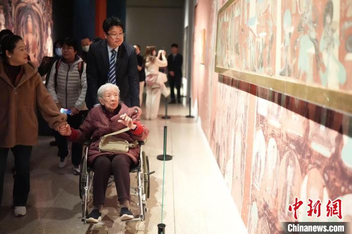 “墨韻文脈——甘肅絲路藝術(shù)珍品展”3月11日在中國美術(shù)館開幕,圖為藝術(shù)家常沙娜在現(xiàn)場參觀。 史春陽 攝