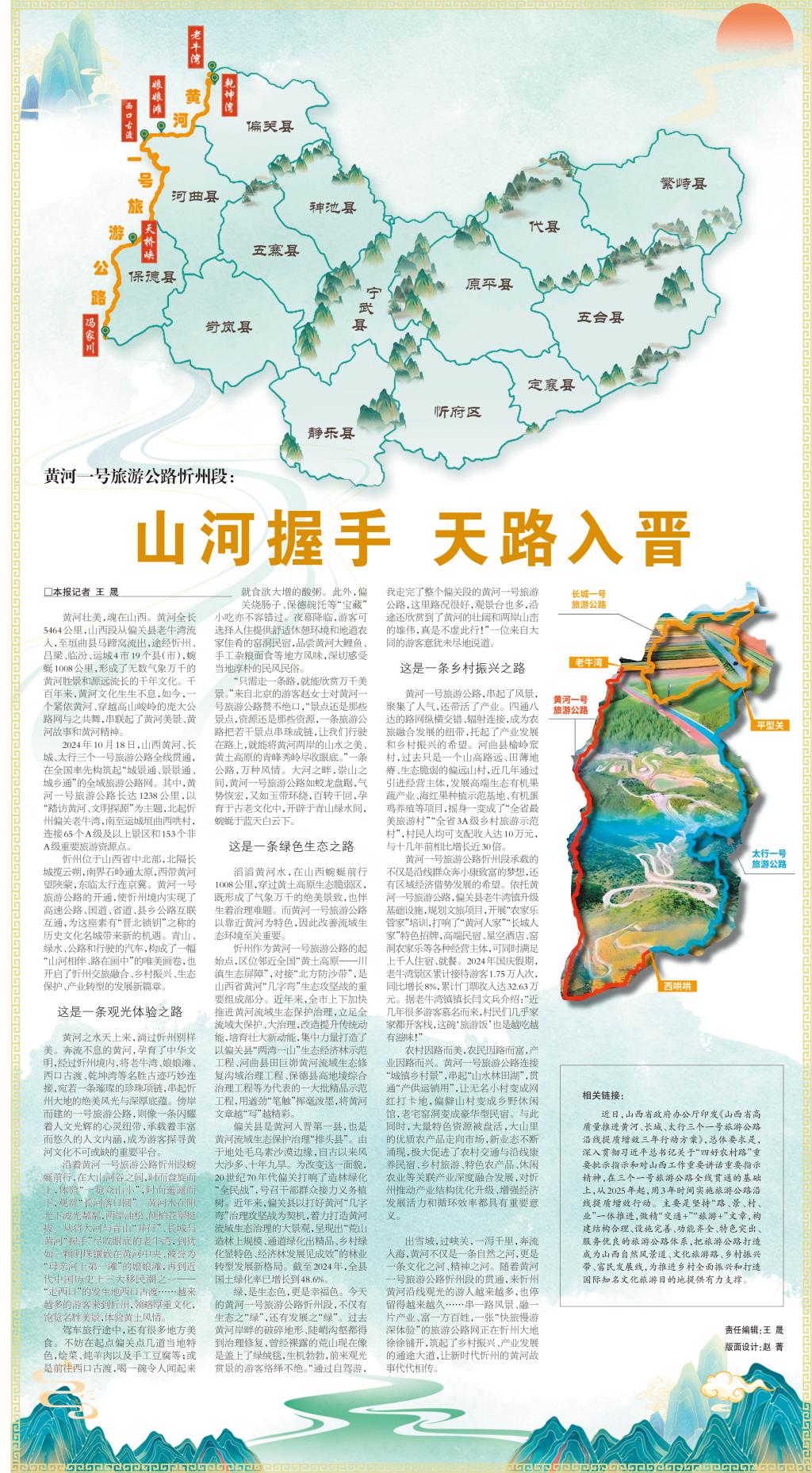 2024年10月18日,山西黃河、長(zhǎng)城、太行三個(gè)一號(hào)旅游公路全線(xiàn)貫通,在全國(guó)率先構(gòu)筑起“城景通、景景通、城鄉(xiāng)通”的全域旅游公路網(wǎng)。其中,黃河一號(hào)旅游公路長(zhǎng)達(dá)1238公里,以“踏訪(fǎng)黃河、文明探源”為主題,北起忻州偏關(guān)老牛灣,南至運(yùn)城垣曲西哄村,連接65個(gè)A級(jí)及以上景區(qū)和153個(gè)非A級(jí)重要旅游資源點(diǎn)。