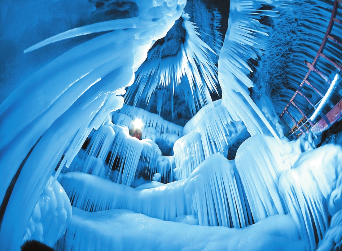萬(wàn)年冰洞 王權(quán) 攝 山水秘境 如果自然景觀有段位,管涔山可以算是“集大成者”。在這片群山中,遍布著林海、草原、草甸、天池、冰洞、河流等豐富多樣的自然景觀,宛如造物主精心打磨雕琢的浩瀚巨著。 這片神奇的山脈有著華北地區(qū)蔚為壯觀的林海資源,是“華北落葉松的故鄉(xiāng)”和“云杉之家”。由華北落葉松和云杉組成的原始次生林如綠色的海洋順著山勢(shì)鋪展。這些挺拔的樹(shù)木,筆直如劍,直插云霄。每當(dāng)山風(fēng)掠過(guò),林海便掀起陣陣松濤,聲如萬(wàn)馬奔騰,氣勢(shì)磅礴。特別是秋季來(lái)臨,層林盡染,金黃、橙紅、深綠的色彩交織在一起,宛如一幅巨大的油畫(huà),令人嘆為觀止。 穿越林海,順著海拔的攀升,平均氣溫與降水量的雙重作用造就了不同的景致。海拔1300米——1600米處,沙棘、黃刺玫等灌木與莜麥田交錯(cuò);1500米——1800米的高度上,針葉林與闊葉樹(shù)共舞;1700米——2600米的山腰處,青杄、白樺成為主角,灌叢間點(diǎn)綴著懸鉤子與野玫瑰,直至頂峰2400米以上,低矮的鬼見(jiàn)愁以及苔草、禾草等植物遍布草甸,宛如高山之上的綠色絨毯。 海拔2784米的荷葉坪是管涔山的最高峰,也是山西省保存完好的天然亞高山草甸,近4萬(wàn)畝的面積像一片無(wú)邊無(wú)際的荷葉鋪展于峰頂之上,素有“高原翡翠”之美稱(chēng)。荷葉坪最為有名的景點(diǎn)當(dāng)屬“荷葉長(zhǎng)老”,有一花崗巖巨石,高達(dá)百米,形似一僧人,背靠巨崖,面向西北,右臂下垂,左臂曲在胸前,指掌分明,面目威嚴(yán)凝重,下巴底有高大繁茂的青松遮蓋,狀如飄卷的胡須。清代詩(shī)人王可受就在詩(shī)作《蘆芽山》中寫(xiě)道:“荷葉坪前客,蓮花峰下人?!痹?shī)中的“客”與“人”描寫(xiě)的就是石景奇觀。 在管涔山的巍峨群峰中,能與荷葉坪相媲美的是馬侖草原。馬倫草原俗名黃草梁,海拔約為2700米,分為前梁、后梁、豬拱坪三大塊。光緒年間的《山西通志》把它比作蘆芽山的北岳,將它與三臺(tái)看花、北峰并稱(chēng)三大美景。夏季來(lái)臨,這里綠草如茵,野花遍地,金蓮花、銀蓮花、龍膽花等數(shù)百種高山花卉競(jìng)相綻放,成群的牛馬悠閑地漫步其間,與藍(lán)天白云構(gòu)成一幅恬靜祥和的牧歌圖景,讓人真切地感受到“天似穹廬,籠蓋四野”的壯美意境。草原的周邊還有不少美景。正南面有奇石坡,造型怪異的巨石聳立坡上,有的像人,有的像獸,有的似鳥(niǎo)又像魚(yú),各個(gè)角度,各種模樣,千奇百怪。西北面有一高臺(tái),俗名草帽頂,傳說(shuō)是遼國(guó)大將韓昌的點(diǎn)將臺(tái)。東南面被稱(chēng)為怪松苑,樹(shù)高三到五米不等,姿態(tài)各異,或像步履蹣跚的老者,或像笑得前仰后合的中年人,或像低頭沉思的秀才,清風(fēng)中觀賞筋骨,新奇中顯露不俗。 更令人稱(chēng)奇的是,在這片群山之中還隱藏著星羅棋布的高山湖泊群。馬營(yíng)海、公海、琵琶海等十余個(gè)天池如明珠般鑲嵌在管涔山馬營(yíng)村北分水嶺上,湖面海拔介于1770-1850米之間,湖水清澈見(jiàn)底,在陽(yáng)光照射下泛著粼粼波光。這些天池不僅景色秀美,更因其“陰霖不溢,陽(yáng)旱不涸”的特性而被古人視為神跡。馬營(yíng)海,也叫“母海”,海拔1771米,是天池湖群中最大的湖泊,面積約0.8平方千米。海拔較高的當(dāng)數(shù)馬營(yíng)海以西山梁北側(cè)的干海子,海拔為1894米。因唐代以前湖泊個(gè)體沒(méi)有獨(dú)立名字統(tǒng)稱(chēng)為天池或祁連池,故管涔山湖泊群也被稱(chēng)為全國(guó)三大高山之一的天池群落。 管涔山還是汾河、恢河、嵐漪河、清漣河的發(fā)源地,一山孕四河,造化非凡。汾者,大也。歷史上的汾源水勢(shì)洶涌,流量很大,太原等地所需木材,從管涔山伐下之后,都要靠汾源水來(lái)運(yùn)送,史書(shū)中就有“萬(wàn)木下汾河”一說(shuō)。柳宗元還在《晉問(wèn)》中生動(dòng)地描繪了唐初管涔山森林繁茂的景象:“晉之北山有異材,卒匠工師為宮室求大木者,夫下暫歸焉?!狈诤幼蠲赖牡胤疆?dāng)屬汾源。徐繼畬在《重修汾源廟樓記》中專(zhuān)門(mén)把汾河上兩個(gè)最美的地方——汾源和晉祠懸甕山作過(guò)對(duì)比,發(fā)出了汾源“薄一溪灌注千里,三境第一圣境也”的贊嘆。汾河的源頭叫雷鳴寺泉,素稱(chēng)“三晉第一泉”。泉水從汾源閣的石縫中流出,流入閣前一個(gè)前圓后方的水塘,塘的石壁上“汾源靈沼”四個(gè)石刻大字隱約可見(jiàn),雖經(jīng)風(fēng)雨侵蝕,仍顯出它的遒勁揮灑?!鞍氘€方塘一鑒開(kāi),天光云影共徘徊?!睋?jù)當(dāng)?shù)厝苏f(shuō),“汾源靈沼”這四個(gè)字在唐代已出現(xiàn),現(xiàn)在還有一塊唐代石碑藏于汾源閣中。古人對(duì)這里甚為推崇,譽(yù)為寧武八景之一。金代大詩(shī)人元好問(wèn)有詩(shī)贊道:“管涔汾源大車(chē)輪,平泉八仗琉璃盒?!被趾釉趯幬淇h境內(nèi)流程約30公里,寧武人習(xí)慣上稱(chēng)之為60里恢河。據(jù)地質(zhì)學(xué)研究,在百萬(wàn)年前,管涔山區(qū)的恢河曾是一條寬闊的大河,后地殼運(yùn)動(dòng),下游抬高,上游降低,河流變小,寧武天池群就是古恢河上游段的遺存。 管涔山最令人稱(chēng)奇的當(dāng)數(shù)其舉世無(wú)雙的“冰火奇觀”。海拔2300米的萬(wàn)年冰洞深藏于春景洼村與麻地溝村之間的高