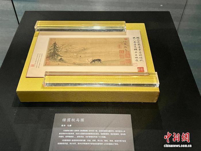 《綠茵牧馬圖》為國家一級文物,由南宋宮廷畫師馬麟所作。畫中牧馬人斜靠在桃林中休息賞景,任由七匹駿馬在綠茵間自由活動,或俯首啃草,或與同伴嬉戲,或奔跑跳躍……姿態(tài)靈動,為曠野春色平添了不少意趣。杜芝明表示,為最大限度地保護(hù)文物,該展品僅面向公眾展出一個月。