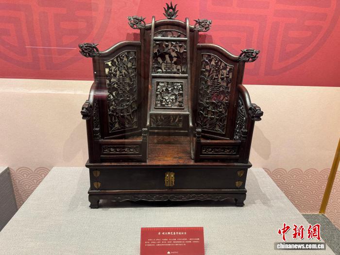 2月12日,“丹宸國(guó)色——沈陽(yáng)故宮博物院建院百年新春特展”在沈陽(yáng)故宮開展。圖為展覽中展出的清硬木雕花喜字梳妝臺(tái)。中新社記者 韓宏 攝 展覽中,清硬木雕花喜字梳妝臺(tái)首次亮相,吸引了游客的駐足圍觀。莊策說(shuō),這件梳妝臺(tái)的三扇屏風(fēng)全部透雕葫蘆紋,且每扇之上皆有一喜字紋。使用時(shí),將配套鏡架置臺(tái)座上承接銅鏡,臺(tái)座抽屜之內(nèi)可放梳妝用具。從雕刻紋飾和形制推測(cè)為皇后大婚時(shí)的妝奩之物。 清代寓意吉祥的載體豐富多樣,范圍不斷延展,從延年益壽、多子多福到求吉納福、平安喜樂。現(xiàn)場(chǎng)展出的粉彩黃地梅鵲大碗、羹匙、小碗、盤等,均為同治皇帝大婚用瓷。據(jù)介紹,同治十一年(1872)同治皇帝大婚。為籌備這次大婚典禮,同治六年(1867)朝廷即命景福燒造大婚用瓷,共14份,9項(xiàng)花色,合計(jì)1萬(wàn)余件。