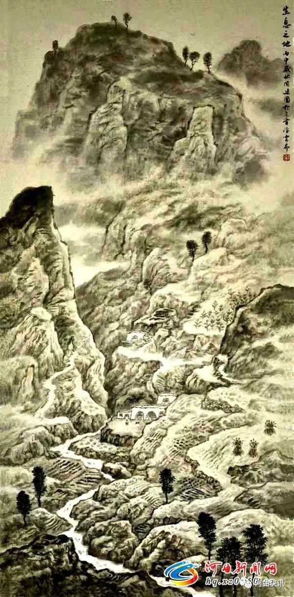 河曲新聞網(wǎng)特稿:不識黃土真面目,只緣生在此山中?非也,至小土生土長在黃土高坡的周建國,卻用繪畫來識別黃土高坡的厚重和秀麗。從他的繪畫里表現(xiàn)出來的滄桑之美正是在他經(jīng)歷了人事浮沉后所潛心追求的別樣山水畫風(fēng)。大美之美固然可畏,但是他給我們看到的卻是那種能給人浩然氣勢的自然大美,美在高山,美在深水。