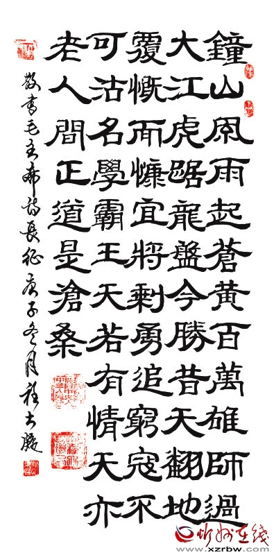 二是程老有真功。他一人能熟練書寫甲骨、篆書、魏碑、曹全隸、乙瑛隸、章草、歐柳楷、顏趙楷、行楷、行書、行草、草書、伊秉綬隸、創(chuàng)新粗圓、創(chuàng)新仿宋、創(chuàng)新大黑、創(chuàng)新角篆、仿毛體18種書體(見圖)。還會(huì)畫畫寫詩,詩書畫樣樣精通。對(duì)程大凝而言,臨帖是他最大的快樂,創(chuàng)作是他最大的滿足?,F(xiàn)在他的工作室有4000多幅作品。退休后參加全國性書法大賽就獲獎(jiǎng)300余次。
