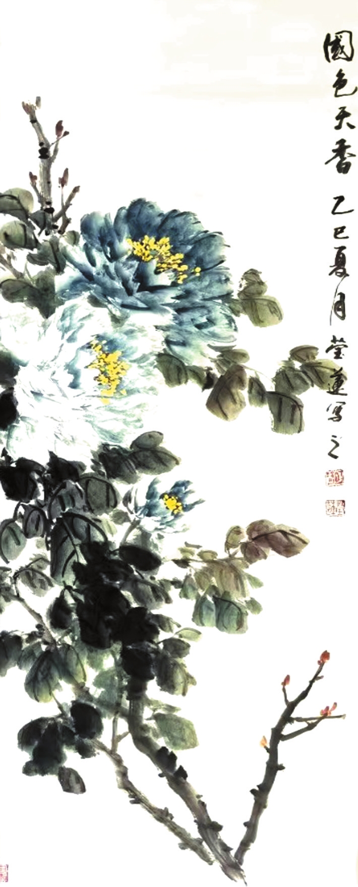 胡瑩蓮的筆墨并非刻意炫技,而是循著“應(yīng)物象形”之理自然生發(fā):牡丹花瓣以淡彩層層暈染,輔以墨線勾勒輪廓,既顯牡丹的華貴之姿,亦存筆墨的清勁骨力;紫藤枝條以側(cè)鋒揮掃而出,既有“折釵股”般的圓勁質(zhì)感,亦見(jiàn)藤蔓的靈動(dòng)意趣。恰如北宋畫(huà)家郭熙在《林泉高致》中所言的“筆補(bǔ)造化”,胡瑩蓮以筆墨為媒介,貫通物象的自然本真與人文意蘊(yùn)。