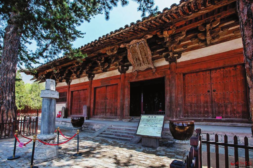 東大殿是寺院的主殿,大殿構架由屋深柱網、鋪作層和屋頂梁架三部分疊加而成,七鋪作斗拱縱橫恣肆,威壓四方,是現(xiàn)存中國古建筑中斗拱挑出層數(shù)最多、距離最遠的一個實例,也是我國集唐代建筑、彩塑、壁畫、題記、經幢于一殿的孤例。