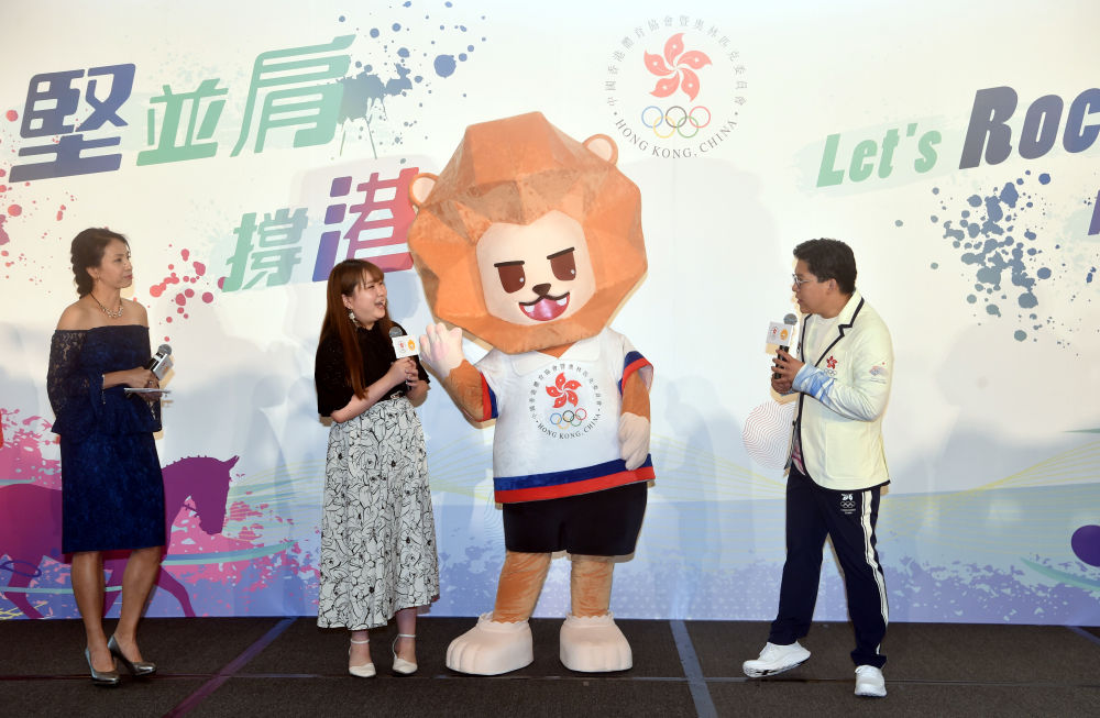 6月15日,中國香港代表團(tuán)吉祥物“堅(jiān)仔”(右二)亮相。新華社記者盧炳輝攝