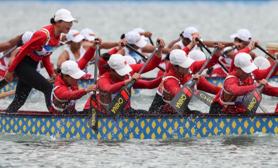 10月6日,在杭州亞運會男子組12人龍舟1000米直道競速賽中,中國隊獲得亞軍。圖為中國隊在比賽中。新華社記者 孟晨光 攝 當(dāng)天,溫州氣溫較前兩個比賽日有所降低,賽道上略有逆風(fēng)。小組賽階段,中國男、女隊均位列小組第一,直接進(jìn)入決賽。而未能直接晉級決賽的隊伍,要經(jīng)過半決賽比拼,這對于龍舟長距離項目來說,隊員體力將經(jīng)受考驗。 男子組決賽中,中國隊出發(fā)順利,在中前段取得領(lǐng)先。但在后半程,龍舟長距離項目傳統(tǒng)強(qiáng)隊印度尼西亞隊開始發(fā)力沖刺,在尾段反超中國隊,最終以0.047秒的優(yōu)勢獲勝。中國隊獲得銀牌,緬甸隊收獲銅牌。
