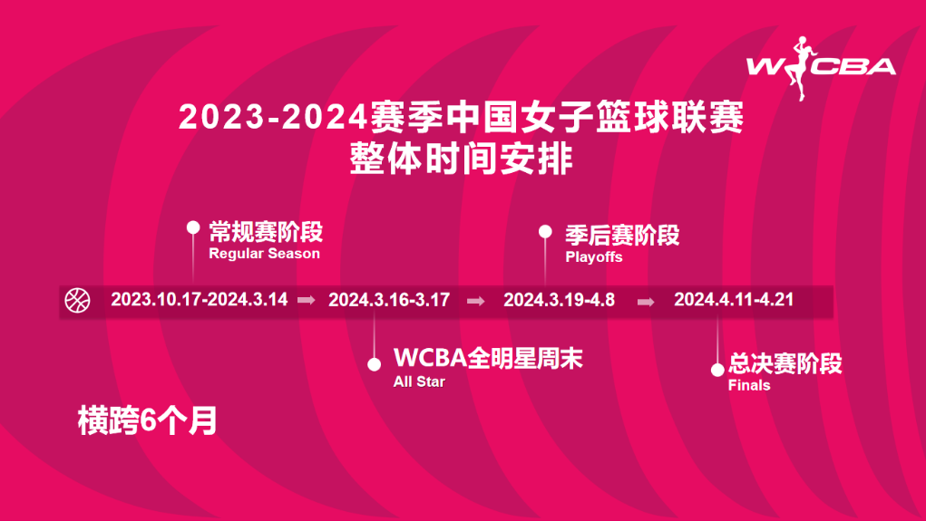 據(jù)了解,2023-2024賽季W(wǎng)CBA聯(lián)賽的整體時(shí)間跨度為6個(gè)月,考慮到新年、春節(jié),以及為國(guó)家隊(duì)備戰(zhàn)和參加巴黎奧運(yùn)會(huì)資格賽留出時(shí)間,聯(lián)賽常規(guī)賽會(huì)分為兩個(gè)階段,第一階段從2023年10月17日至2024年1月1日,第二階段從2024年2月17日至3月14日。全明星周末活動(dòng)將在2024年3月16至17日舉辦。季后賽和總決賽階段從3月19日至4月21日。