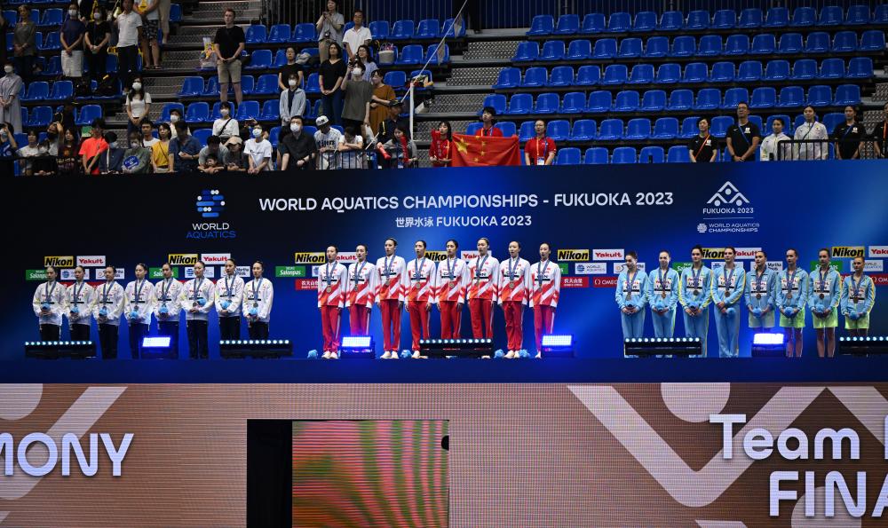7月21日,在日本福岡舉行的2023年世界游泳錦標(biāo)賽花樣游泳集體自由自選決賽中,中國(guó)隊(duì)以329.1687分的成績(jī)獲得冠軍。新華社記者 夏一方 攝