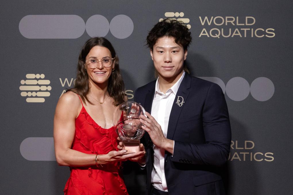 10月23日,在匈牙利布達(dá)佩斯,中國(guó)選手覃海洋獲選世界泳聯(lián)年度最佳男子游泳運(yùn)動(dòng)員,澳大利亞選手麥基翁獲選最佳女子游泳運(yùn)動(dòng)員。新華社發(fā)(弗爾季·奧蒂洛攝)