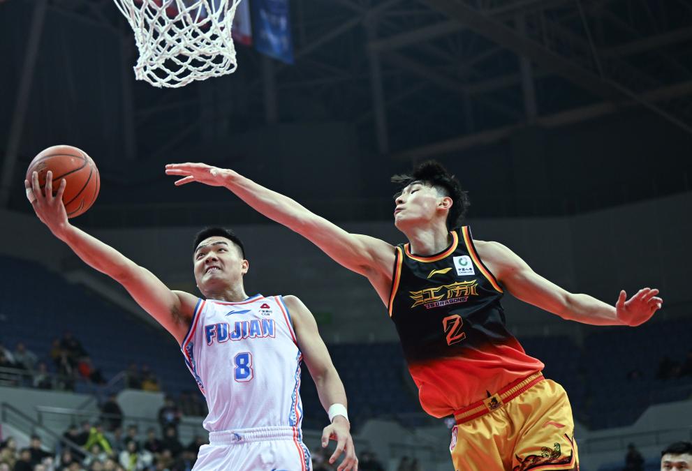 1月4日,福建隊球員黎伊揚(左)在江蘇隊球員馬建豪的防守下上籃。新華社發(fā)(王須中攝)