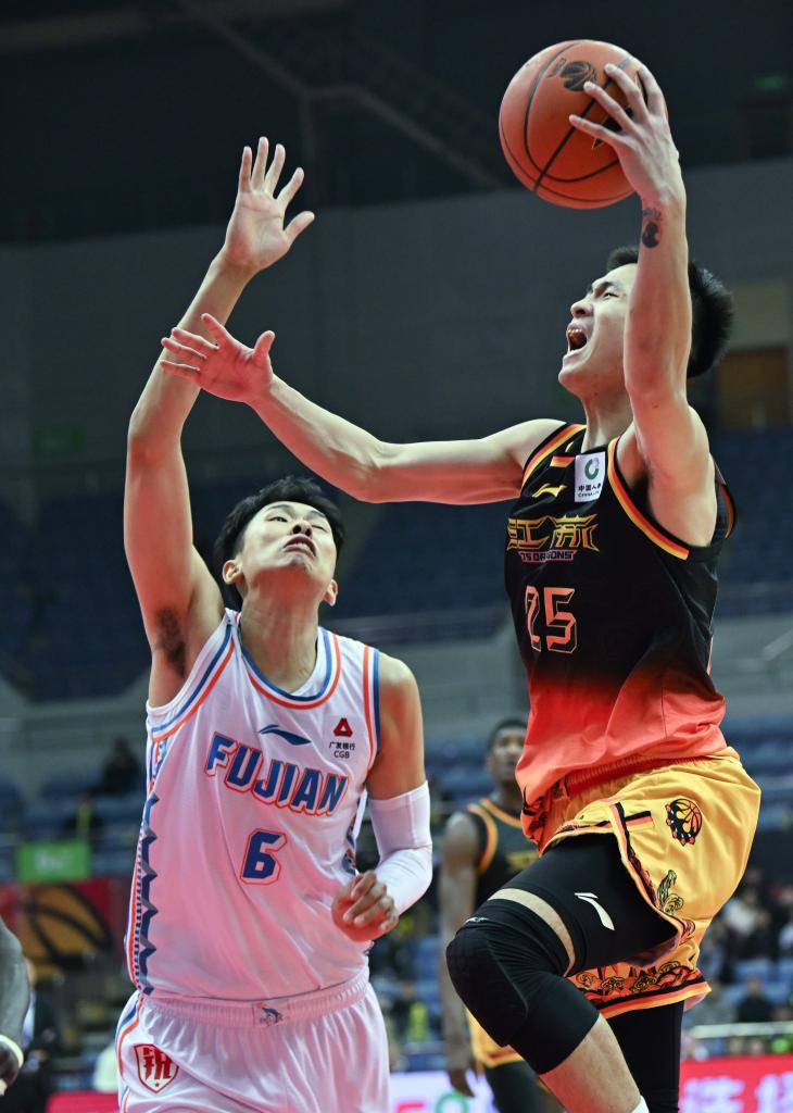 1月4日,江蘇隊球員崔曉龍(右)在福建隊球員鄒陽的防守下上籃。新華社發(fā)(王須中攝)