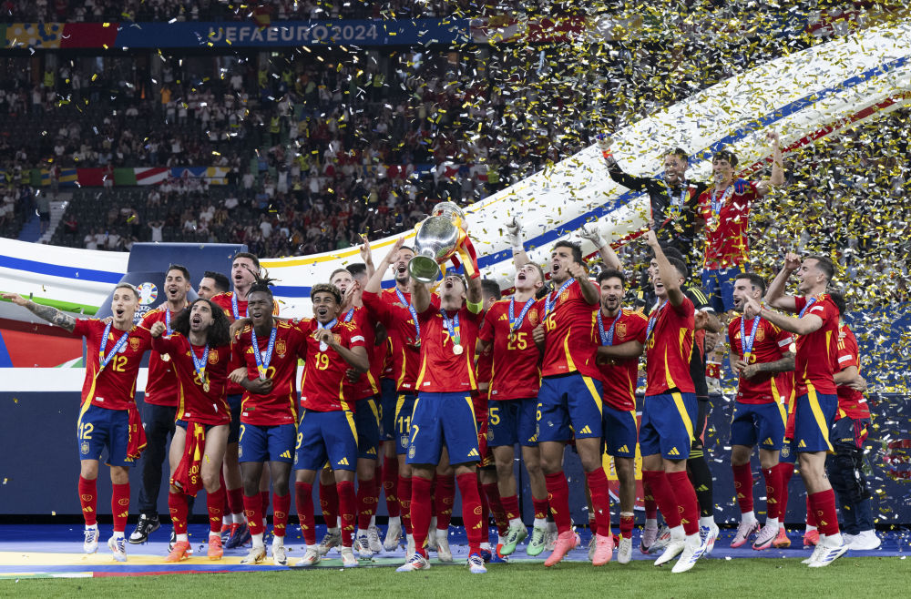 7月14日,西班牙隊在頒獎儀式上慶祝。當日,在德國柏林進行的2024年歐洲足球錦標賽決賽中,西班牙隊2比1戰(zhàn)勝英格蘭隊,第四次奪得歐錦賽冠軍。新華社記者 肖藝九 攝