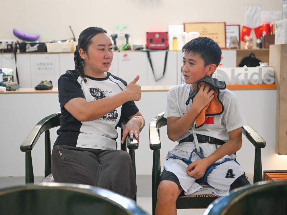 7月16日,方先旻的媽媽在訓練間隙鼓勵孩子。新華社記者 王曦 攝