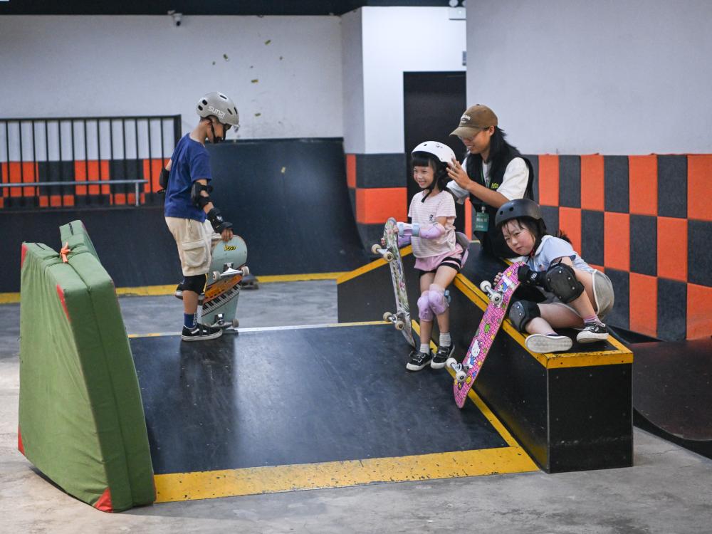 7月17日,閤靈暄(左二)正在進行滑板訓練。新華社記者 王曦 攝