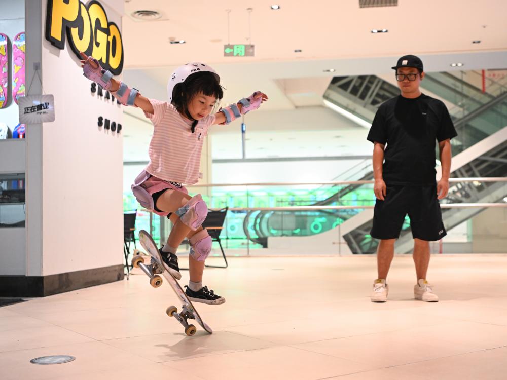 7月17日,閤偉峰正在看女兒閤靈暄(左)練習滑板。新華社記者 王曦 攝