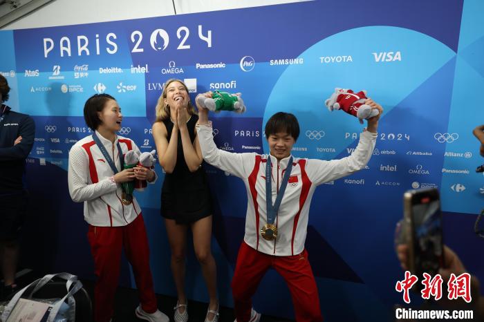 當(dāng)?shù)貢r(shí)間7月31日,在巴黎奧運(yùn)會(huì)跳水女子雙人10米臺(tái)項(xiàng)目中,中國隊(duì)組合陳芋汐/全紅嬋獲得冠軍。谷愛凌(中)在賽后化身粉絲與陳芋汐(左)、全紅嬋合影。 中新社記者 富田 攝