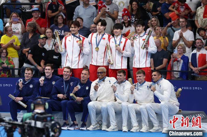 當(dāng)?shù)貢r(shí)間8月4日,在巴黎奧運(yùn)會(huì)游泳項(xiàng)目男子4x100米混合泳接力決賽中,由徐嘉余、覃海洋、孫佳俊、潘展樂組成的中國隊(duì)奪得金牌。圖為獲獎(jiǎng)運(yùn)動(dòng)員合影。 中新社記者 富田 攝