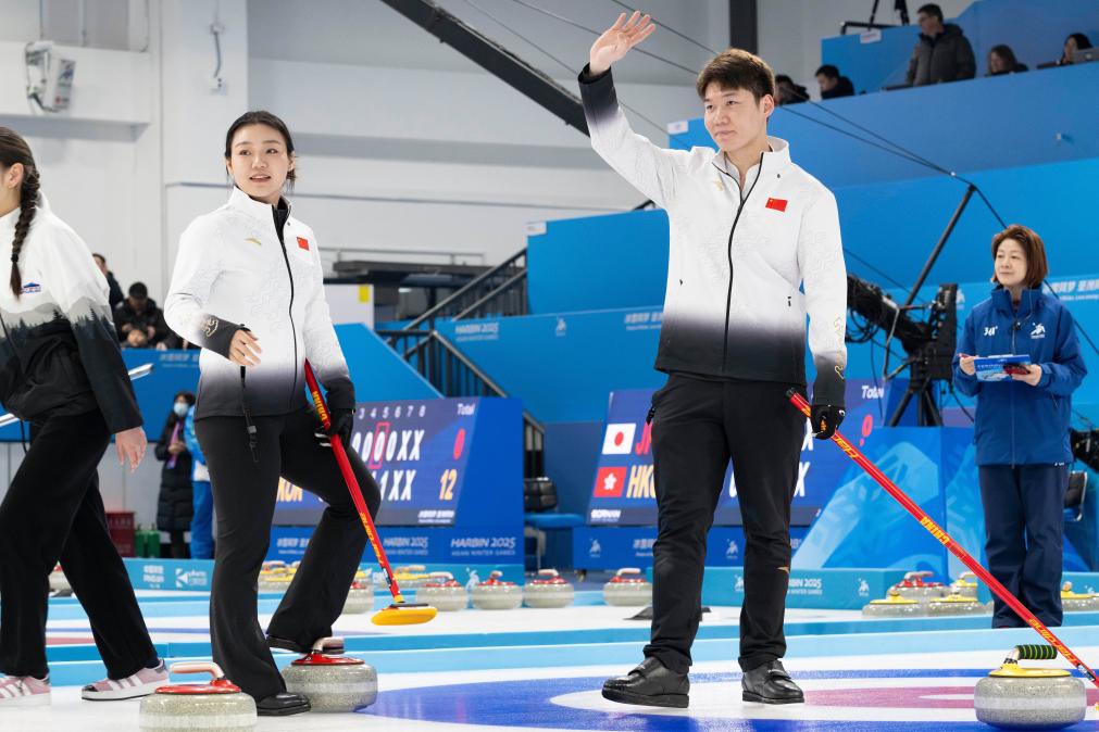 2月5日,中國隊選手王智宇(前右)/韓雨在賽后向觀眾致意。當(dāng)日,在哈爾濱舉行的2025年第九屆亞冬會冰壺混雙循環(huán)賽B組第三輪比賽中,中國隊8:3戰(zhàn)勝吉爾吉斯斯坦隊。新華社記者 謝劍飛 攝