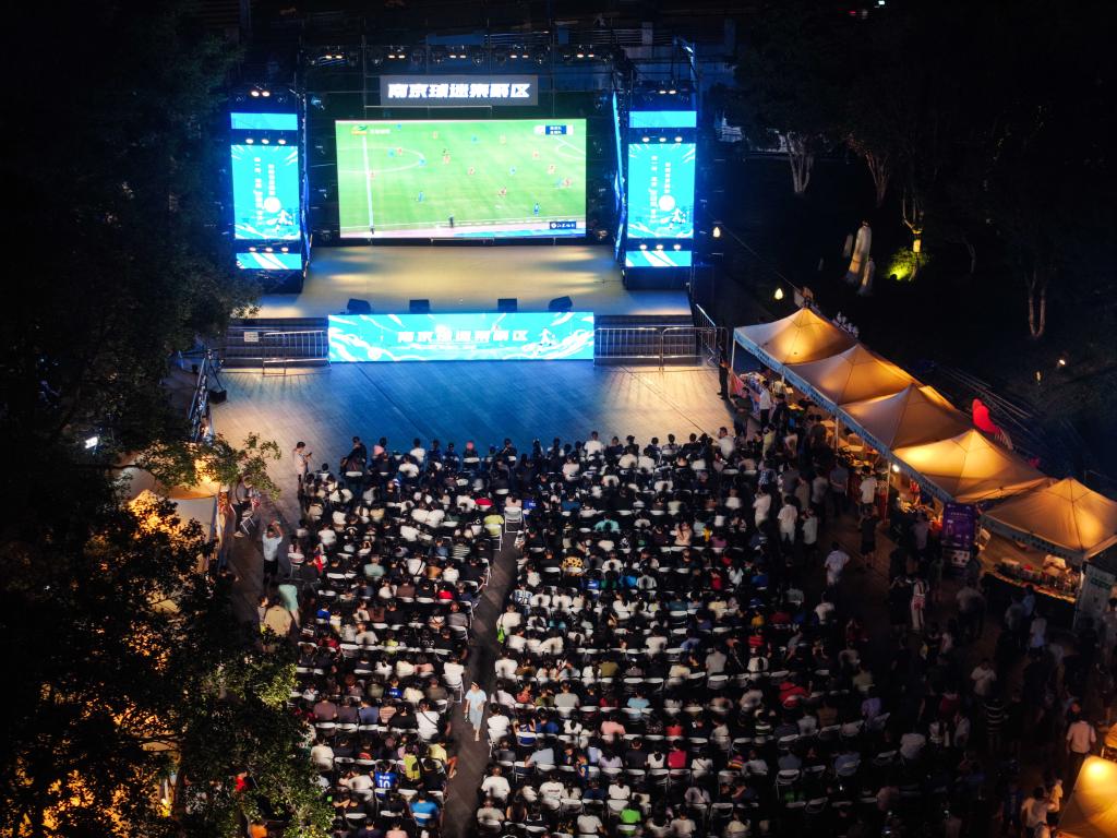 8月17日,球迷在南京一個露天屏幕前觀看2025江蘇省城市足球聯賽(“蘇超”)第九輪比賽。新華社記者 季春鵬 攝