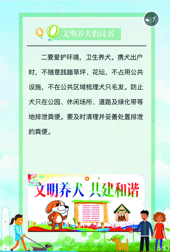 在宣傳活動中,民警深入街道、小區(qū)、商鋪等人員密集場所,在宣傳欄懸掛文明養(yǎng)犬宣傳標(biāo)語、張貼文明養(yǎng)犬倡議書等宣傳資料,向轄區(qū)居民詳細(xì)講解《忻州市養(yǎng)犬管理?xiàng)l例》《文明養(yǎng)犬公告》的具體內(nèi)容,引導(dǎo)養(yǎng)犬群眾主動辦理養(yǎng)犬登記證、出門為犬只佩戴犬牌、定期為犬只注射疫苗,做到依法養(yǎng)犬、文明養(yǎng)犬、衛(wèi)生養(yǎng)犬、健康養(yǎng)犬、安全養(yǎng)犬。活動中,該局共懸掛宣傳標(biāo)語50條,張貼文明養(yǎng)犬倡議書500份,向群眾發(fā)放宣傳資料3500人/份。