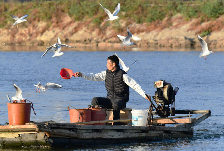 2025年12月10日,福建省漳州市佛曇鎮(zhèn)東坂村河豚養(yǎng)殖戶在給河豚投喂食物。新華社記者 魏培全 攝