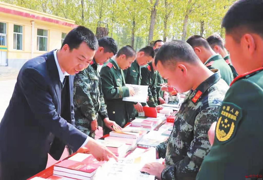 為豐富駐忻武警官兵的文化生活,近日,市新華書店開展了“送書進(jìn)軍營”活動(dòng),給武警官兵帶去了豐富的精神食糧。(張存良 攝)