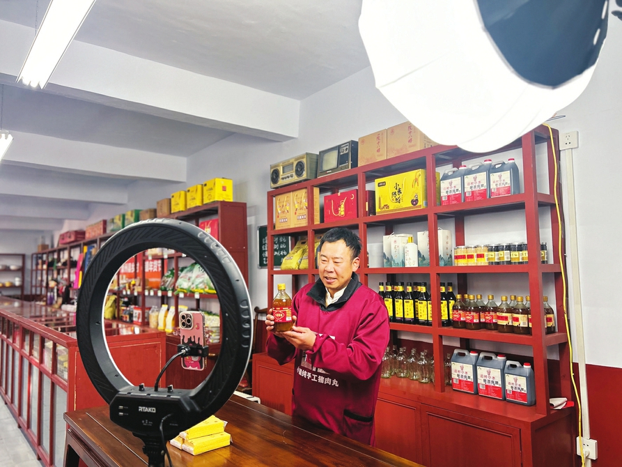 宋小朋在保福村供銷社里直播推介當?shù)剞r(nóng)產(chǎn)品。晉睿攝