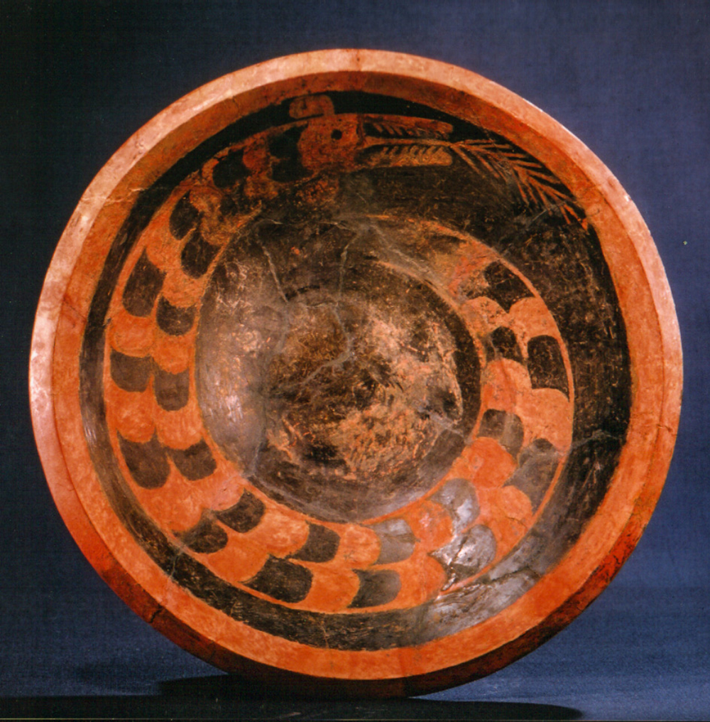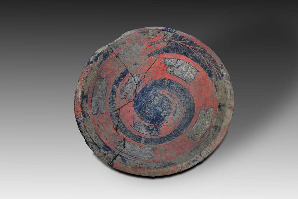 彩繪龍盤于1980年出土于陶寺遺址,灰褐色陶胎,敞口、折腹、平底,通體磨光。盤底用紅彩涂色,紅灰相間的蟠龍圍繞紅色圓盤面盤旋,蟠龍身盤如蛇,體上有似鱷魚一樣的鱗狀斑紋,口銜枝狀物,專家辨識后認為是禾苗。