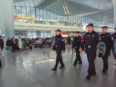 在太原南站,隨處可見民警堅守一線守護平安的身影。本報記者郭寧攝