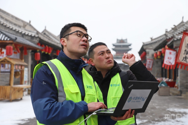 離開商鋪,郭勇和同事又來到古縣城十字街的中心點(diǎn),這里是古縣城人流最為密集的地方,也是游客用網(wǎng)需求最大的地方?!霸谥行奈恢?,我們放置了2個5G基站,同時在城墻外放置了6個,內(nèi)城墻上放置了7個,還在一些網(wǎng)絡(luò)覆蓋較弱的小街道放置了‘微站’設(shè)備進(jìn)行擴(kuò)容。春節(jié)期間,我們還會組織應(yīng)急保障隊(duì)進(jìn)行通信保障,通過這樣的基站布局最大限度保障游客的通信順暢?!闭f話間,郭勇和同事一人操作電腦,一人操作手機(jī)已經(jīng)完成了此處的信號測試。