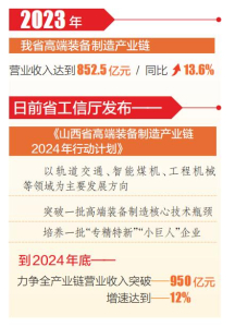 省工信廳日前發(fā)布《山西省高端裝備制造產(chǎn)業(yè)鏈2024年行動計劃》,確立年度推進(jìn)目標(biāo):以軌道交通、智能煤機(jī)、工程機(jī)械等領(lǐng)域為主要發(fā)展方向,突破一批高端裝備制造核心技術(shù)瓶頸,培養(yǎng)一批“專精特新”“小巨人”企業(yè),提升全產(chǎn)業(yè)鏈科技創(chuàng)新能力,強(qiáng)化高端裝備制造供應(yīng)鏈穩(wěn)定性和配套能力。并提出,到2024年底,力爭全產(chǎn)業(yè)鏈營業(yè)收入突破950億元,增速達(dá)到12%。
