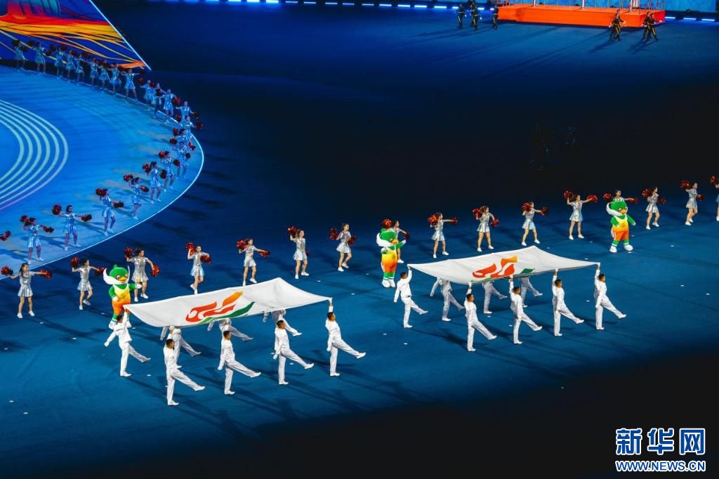 ??山西省運(yùn)動會會旗、第十六屆省運(yùn)會會旗入場。新華網(wǎng) 發(fā)(馬夢迪 攝)