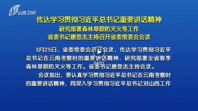 山西日報(bào)報(bào)道 3月25日,省委常委會召開會議,傳達(dá)學(xué)習(xí)貫徹習(xí)近平總書記在云南考察時(shí)的重要講話精神,研究部署全省春季森林草原防滅火等工作。省委書記唐登杰主持會議。