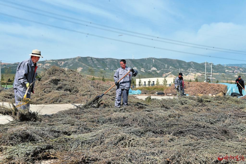 在康茂高原生物科技股份有限公司院內,工人們正在翻曬艾草。 記者 馮曉磊攝