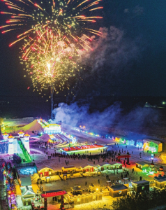 大同魏都水世界晶瑩剔透的冰雕、五光十色的彩燈,在焰火的映照下,盡顯“年味”。
