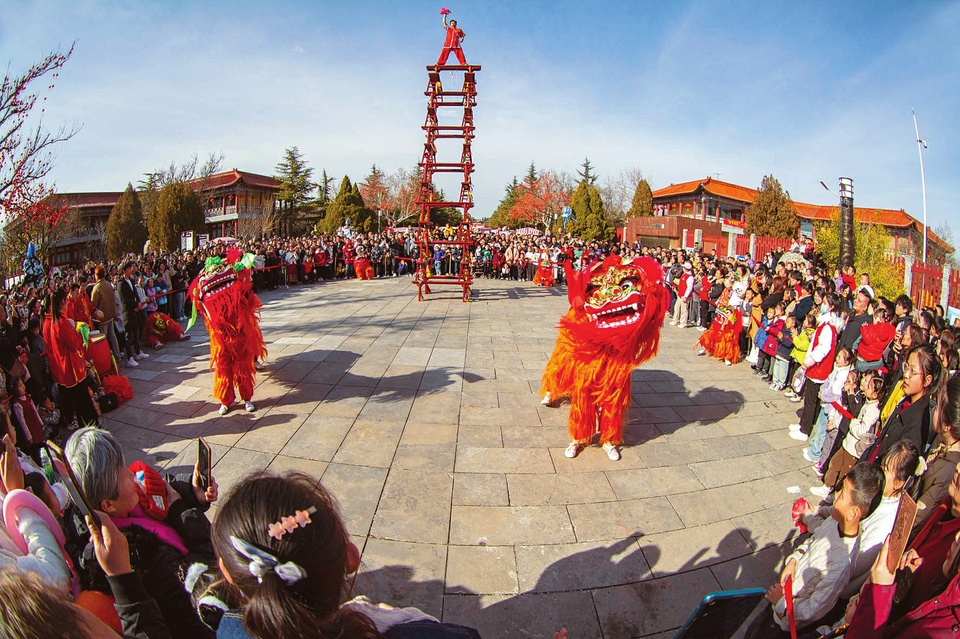 運(yùn)城市鹽湖區(qū)舜帝陵景區(qū)內(nèi)舞獅隊(duì)正在進(jìn)行舞獅表演。姜樺攝