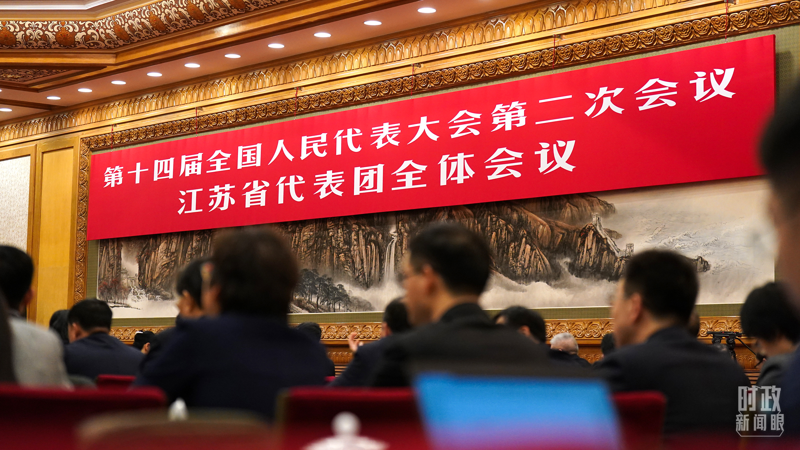 △江蘇代表團(tuán)全體會議,會標(biāo)醒目。(總臺國廣記者李晉拍攝)