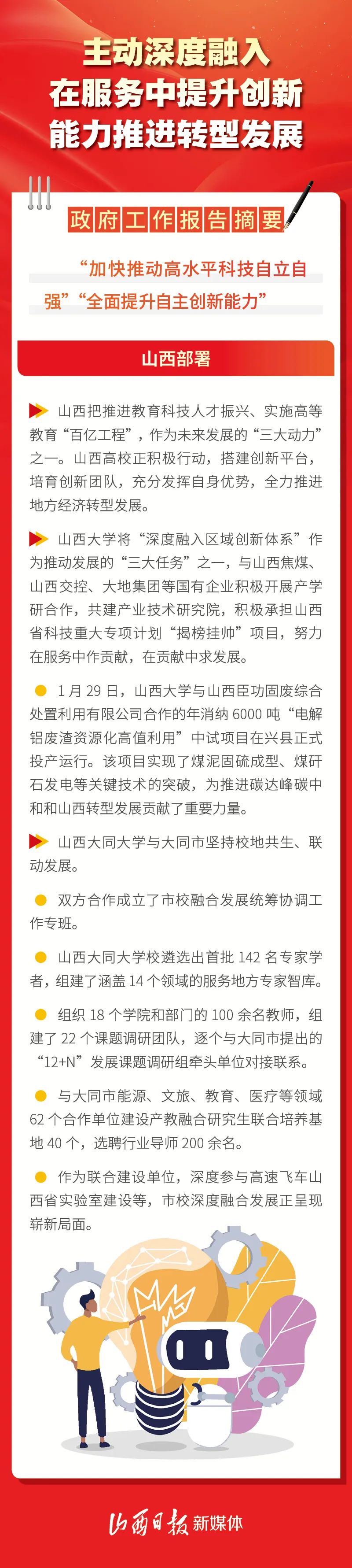 今年政府工作報告指出,堅持教育強國、科技強國、人才強國建設一體統(tǒng)籌推進,創(chuàng)新鏈產(chǎn)業(yè)鏈資金鏈人才鏈一體部署實施。這為山西高校更好地服務全省各地轉型發(fā)展、高質量發(fā)展提供了遵循。