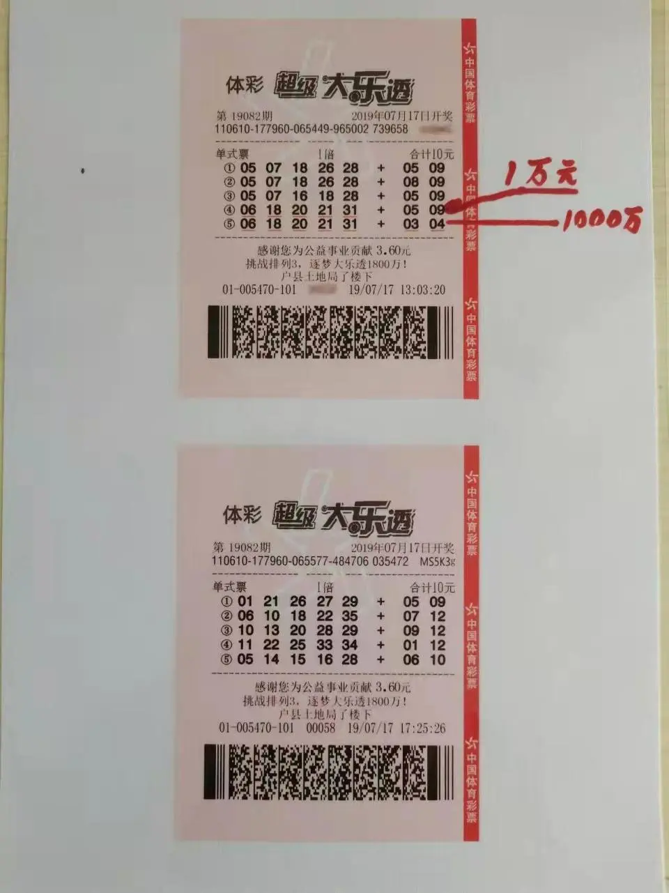 兩張彩票其中一張中獎,一組號碼中獎1萬元,另一組號碼中獎1000萬元 王先生解釋,當日下午5時許,姚先生微信發(fā)來紅包,注明“機選大樂透10”,自己在發(fā)送彩票照片時誤將下午高某購買的彩票發(fā)給了姚先生。這張彩票原本是當天下午1時,另一彩民自選號碼的彩票。因第一次出票失誤,又重新出票,最后將多出的這張彩票轉賣給了高某,高某則將彩票遺忘在柜臺。 高先生則稱,7月17日當天購買已經(jīng)打印好的彩票后,在店內(nèi)和王先生聊天,離開時將彩票、香煙、打火機一并遺忘在王先生店內(nèi)。當晚8時,王先生將彩票送還。同年9月5日兌獎。 同年9月5日,這張彩票兌了獎,姚先生通過委托律師申請調(diào)查了解到,領獎人高某系彩票店老板王先生的表哥。 當日一彩民前往該投注站,自選號碼追加投注。然而,彩票店失誤打成了未追加。隨后同號碼重新出票。這重新出票的彩票喜中1800萬。姚先生微信購買隨機號碼彩票,彩票店負責人將這張出錯的彩票拍照發(fā)給了他,雙方在微信上進行了確認。這張出錯的彩票也中得1001萬。
