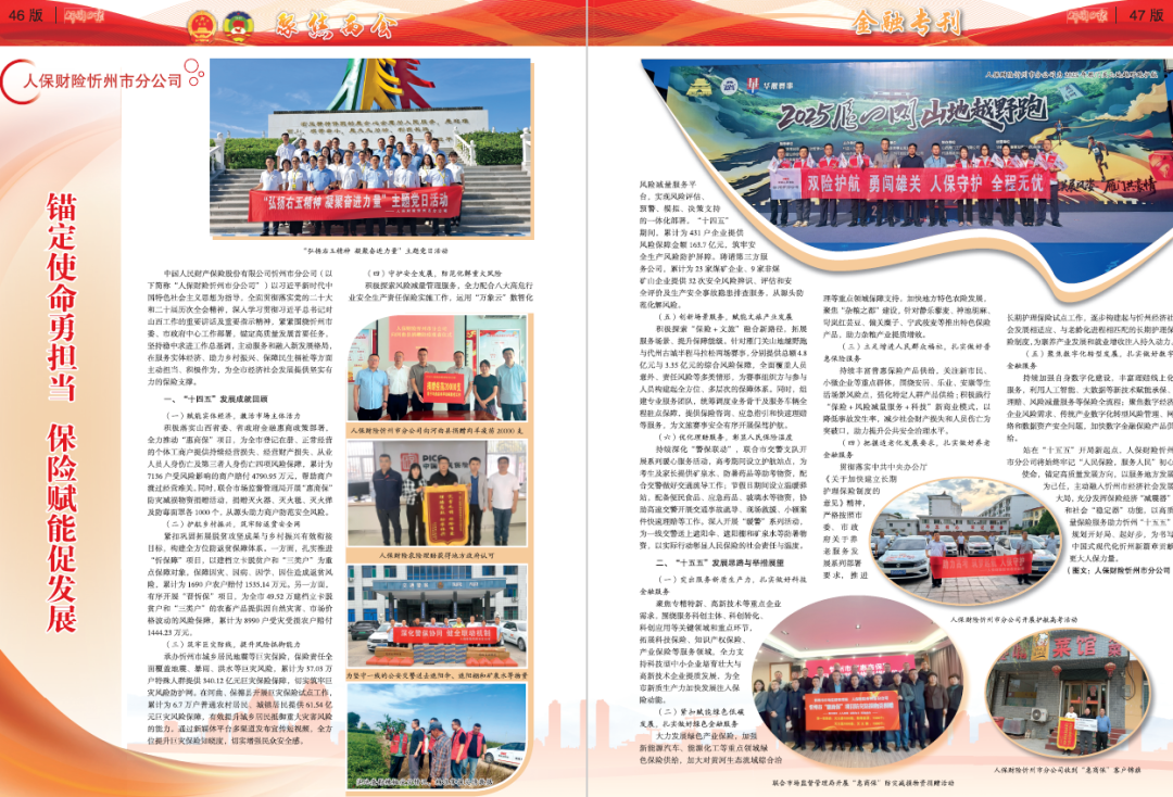 中國(guó)人民財(cái)產(chǎn)保險(xiǎn)股份有限公司忻州市分公司(以下簡(jiǎn)稱“人保財(cái)險(xiǎn)忻州市分公司”)以習(xí)近平新時(shí)代中國(guó)特色社會(huì)主義思想為指導(dǎo),全面貫徹落實(shí)黨的二十大和二十屆歷次全會(huì)精神,深入學(xué)習(xí)貫徹習(xí)近平總書記對(duì)山西工作的重要講話及重要指示精神,緊緊圍繞忻州市委、市政府中心工作部署,錨定高質(zhì)量發(fā)展首要任務(wù),堅(jiān)持穩(wěn)中求進(jìn)工作總基調(diào),主動(dòng)服務(wù)和融入新發(fā)展格局,在服務(wù)實(shí)體經(jīng)濟(jì)、助力鄉(xiāng)村振興、保障民生福祉等方面主動(dòng)擔(dān)當(dāng)、積極作為,為全市經(jīng)濟(jì)社會(huì)發(fā)展提供堅(jiān)實(shí)有力的保險(xiǎn)支撐。
