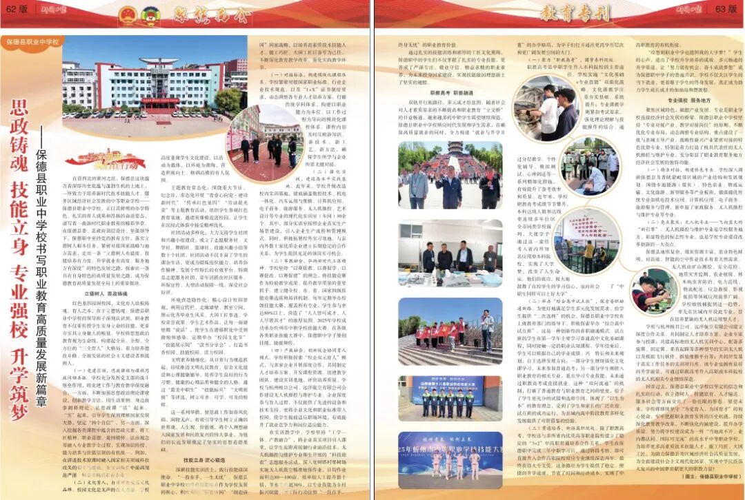 回首過去,保德縣職業(yè)中學(xué)校以堅定的信念和扎實的行動,在立德樹人、技能培育、人才輸送、服務(wù)社會等方面交出了一份亮眼的答卷。展望未來,學(xué)校將繼續(xù)堅守“為黨育人、為國育才”的初心使命,牢牢把握職業(yè)教育發(fā)展的歷史機遇,持續(xù)深化教育教學(xué)改革,不斷強化內(nèi)涵建設(shè),提升辦學(xué)質(zhì)量。努力將學(xué)校建設(shè)成為一所“當?shù)仉x不開、業(yè)內(nèi)都認同、國際可交流”的高水平中等職業(yè)學(xué)校,為培養(yǎng)更多高素質(zhì)技術(shù)技能人才、能工巧匠、大國工匠,為助力保德縣及區(qū)域經(jīng)濟社會高質(zhì)量發(fā)展,為全面建設(shè)社會主義現(xiàn)代化國家、實現(xiàn)中華民族偉大復(fù)興的中國夢貢獻更大的職教力量!